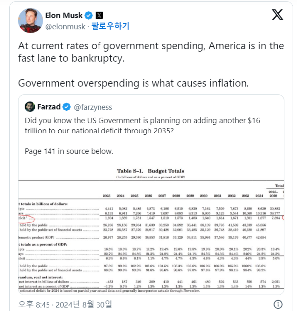 30일(현지시간) 크립토타임즈에 따르면 일론 머스크는 엑스(구 트위터)를 통해 미국 정부의 과도한 지출을 비판하며, 2035년까지 추가로 16조 달러의 적자가 예상된다는 국가 재정 데이터에 대해 언급했다.