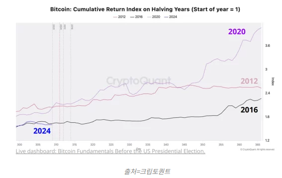 시장의 방향성이 아직 불확실한 가운데, 전문가들은 지난 세 번의 미국 대선 이후 비트코인 가격이 상승했다고 전했다. 온체인 분석 플랫폼 크립토퀀트는 보고서에서 “2016년 비트코인 가격은 선거일 이후 연말까지 37% 상승했고, 2020년 선거 이후에는 거의 98% 급등했다”고 설명했다. 이어 “현재 비트코인은 2016년과 매우 유사한 흐름을 보인다”고 덧붙였다.