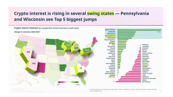 안드레센 호로위츠는 경합주에서 가상자산에 대한 관심도를 측정하기 위해 구글 트렌드를 활용해 상대적 관심도를 분석했다. 보고서에 따르면 이번 대선에서 가장 치열한 접전이 예상되는 펜실베이니아와 위스콘신은 2020년 대선 이후 구글 트렌드 기준 가상자산 검색 관심도에서 각각 4, 5위를 차지하며 큰 폭의 상승을 기록했다.