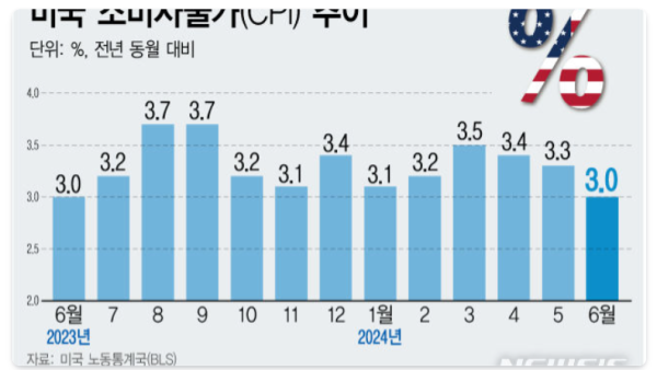 ◆美 6월 CPI 상승률 3.0%로 1년래 최저치…”급격한 둔화”