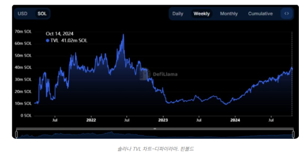 밈코인은 탄탄한 펀더멘탈을 지니고 있지는 않다. 그러나 밈코인 인기는 솔라나 네트워크의 활동을 증대시켰다. 총 예치 자산(TVL)과 같은 주요 지표들이 상승하고 있다. TVL은 블록체인의 스마트 계약에 잠긴 자금의 총량을 의미한다.