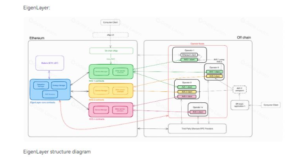 반면, 아이겐레이어는 기본적으로 이더리움이 스마트계약을 지원(완전한 튜링) 하기 때문에 사용자의 스테이킹 기능을 수용하고  AVS(Actively Validated Services) 계약을 관리하는 일련의 스마트 계약으로 구성된다.