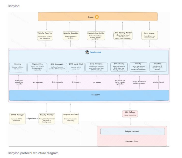 비트코인의 경우 완전한 튜링(프로그래밍언어가 복잡한 프로그램을 수행할 수 있는 능력, 이더리움은 가능)에 제한이 있다. 따라서 바빌론은 별도의 체인에서 이러한 작업을 직접 처리해야 한다. 이를 위해 바빌론은 코스모스 SDK를 기반으로 자체 체인을 구축한 뒤 해당 체인에는 자체 검증노드를 구성했다.