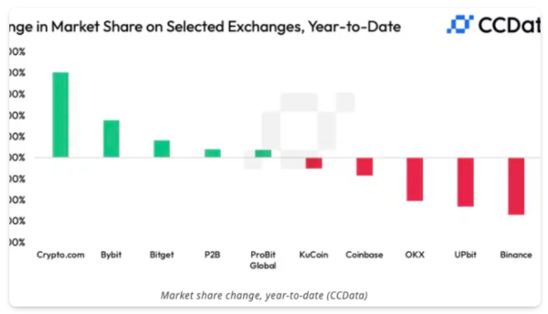 반면 경쟁사 크립토닷컴(Crypto.com)은 같은 기간 성장세를 보였다. 크립토닷컴은 월간 기준 현물 및 파생상품 거래량이 40% 이상 증가했으며, 현물 거래 시장 점유율도 10.5%로 확대됐다.