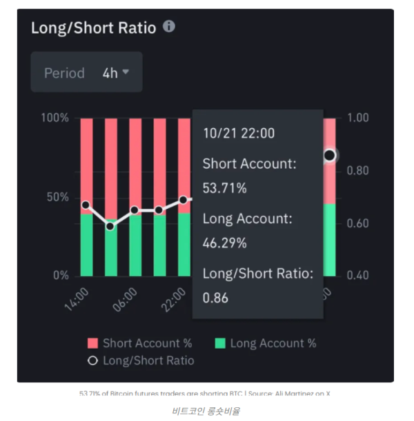 바이낸스의 4시간 롱-숏 비율 데이터에 따르면 53.71%의 선물 트레이더들이 비트코인을 숏 포지션으로 설정했다. 이는 트레이더들 사이에서 비트코인이 6만 9000달러를 돌파할 시기를 두고 불확실성이 크다는 신호로 해석된다. 숏 포지션이 계속된다면 비트코인의 상승 모멘텀에 일시적인 제동이 걸릴 수도 있다.