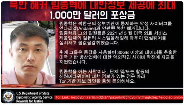 한국 경찰청 국가수사본부는 지난 21일 국내 가상자산 거래소 ‘업비트’에 보관돼 있던 암호화폐 ‘이더리움’ 34만2000개가 2019년 11월 탈취된 사건과 관련, 북한 정찰총국 소속 해킹조직 ‘라자루스’와 ‘안다리엘’ 등의 소행이라고 밝혔다.