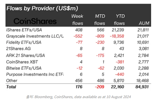출처: Bloomberg, CoinShares, data available as at 10 August 2024