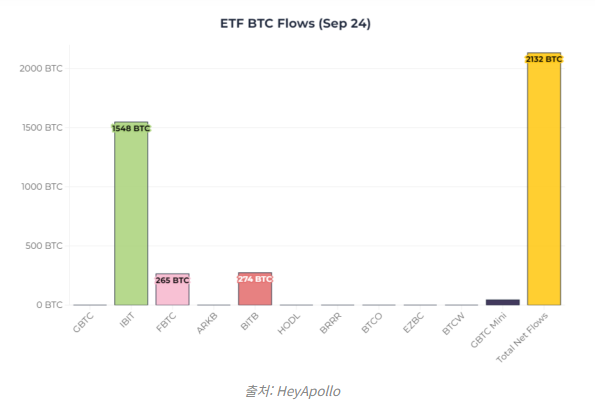 한편 헤이아폴로 데이터에 의하면 화요일 비트코인 현물 ETF의 순유입은 2132 BTC에 해당되며 이는 비트코인의 현재 일일 발행량 약 450 BTC의 거의 5배에 달한다.