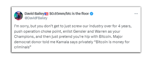 “우리 산업을 4년 동안 망쳐 놓고, 작전 초크 포인트를 추진하고, 겐슬러와 워런을 당신의 챔피언으로 삼고, 그냥 비트코인을 좋아하는 척할 수는 없다. 주요 민주당 기부자가 카멀라가 사적으로 ‘비트코인은 범죄자의 돈이다’라고 말했다고 하더라”