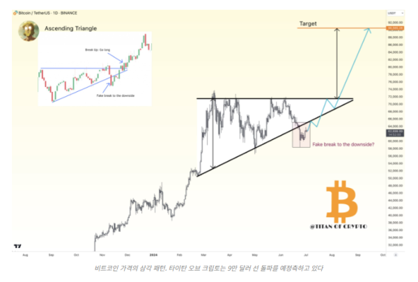 비트코인 가격의 삼각 패턴. 타이탄 오브 크립토는 9만 달러 선 돌파를 예정측하고 있다