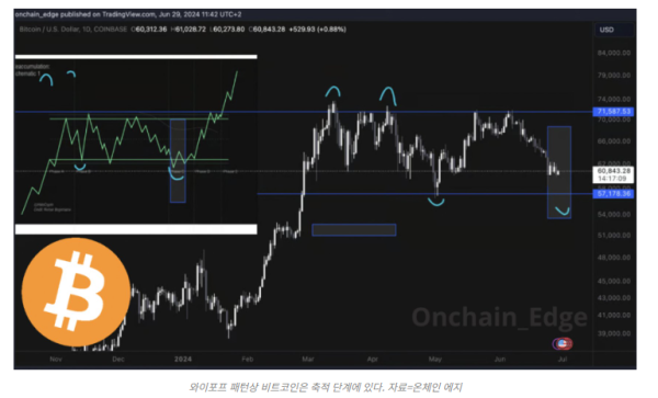 와이코프 방법을 사용한 기술 분석은 현재 비트코인 가격 조정의 끝을 예고한다. 크립토퀀트(CryptoQuant)에서 활동하는 분석가 온체인 에지(Onchain Edge)는 와이코프 패턴과 비트코인 거래소 예치금 감소에 기반해 비트코인이 돌파 준비를 하고 있다고 주장했다.