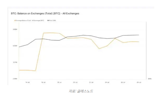 글래스노드 데이터에 따르면, 7월 15일부터 7월 28일까지 비트코인의 거래소 보유량이 크게 증가하며, 총 3만5000 BTC이 거래소 주소로 이동했다.