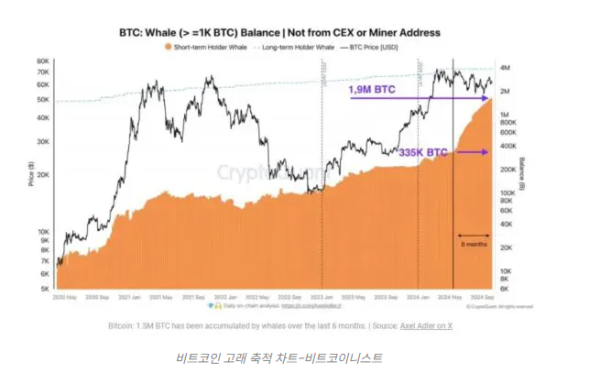 크립토 애널리스트이자 투자자인 악셀 애들러(Axel Adler)는 이러한 추세를 강조하며, 고래들이 공격적으로 BTC를 매수하는 차트를 공유했다. 그는 1000 BTC 이상의 잔액을 보유한 고래들이 지난 6개월 동안 150만 BTC를 추가로 보유하게 되었다고 설명했다.