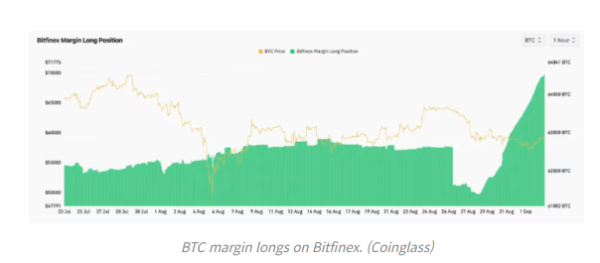 그리크스.라이브(Greeks.Live)에 따르면 8월 28일부터 비트파이넥스에서 마진 롱 포지션, 즉 차입금을 이용해 비트코인을 매수하는 포지션은 3000 BTC 증가해 총 6만4350 BTC에 이르렀다. 이와 동시에 차입금에 부과되는 연이율 금리는 지난 10시간 동안 20%를 넘어서며 급등했다.
