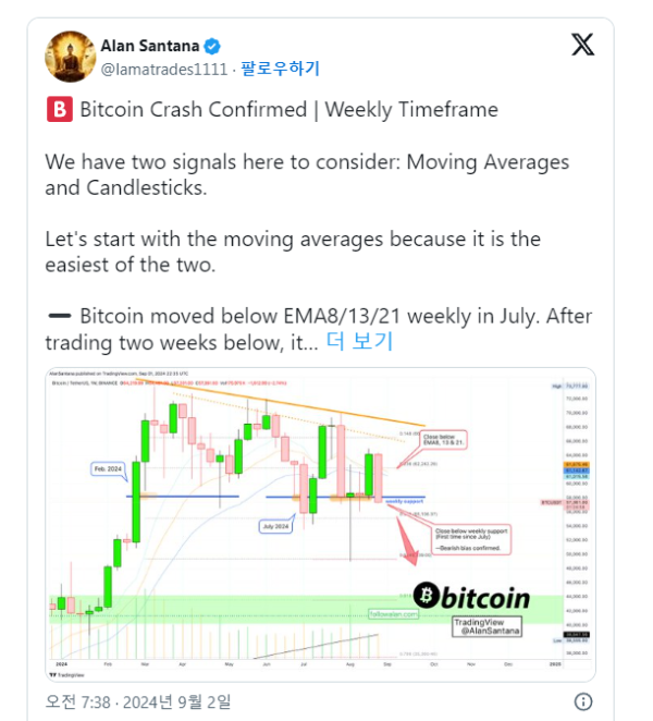 2일(현지 시간) 암호화폐 분석가 산타나는 엑스와 트레이딩뷰의 13만 명 구독자들에게 “이동평균선과 봉차트로 볼 때 현재로써는 비트코인에 대해 어떠한 긍정적 신호도 찾을 수 없다” 며 “비트코인 가격이 4만3000 달러 및 3만8000 달러 수준까지 하락할 수 있다” 고 주장했다.