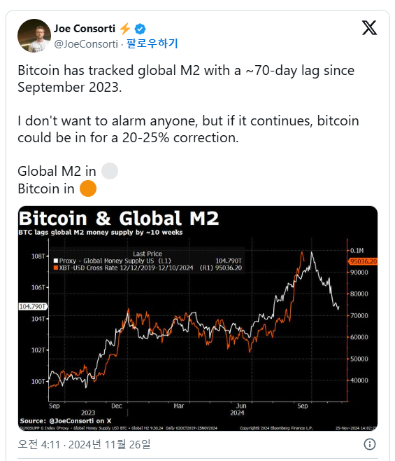비인크립토는 26일 비트코인 커스터디 회사 테야(Theya)의 성장 책임자인 조 콘소르티를 인용, “비트코인과 글로벌 M2 통화 공급이 70일 시차를 두고 상관 관계에 놓여있다”며 “최근 M2 감소가 BTC 가격에 부정적인 영향을 미칠 수 있다”고 분석했다.