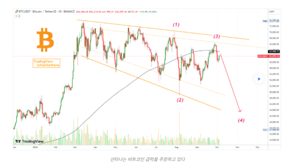 알란 산타나는 이날 트레이딩뷰(TradingView) 게시물에서 비트코인의 주요 지지선, 특히 200일 이동평균선 유지를 거듭 실패하는 것이 주요 하락 신호라고 지적했다. 그는 비트코인이 9월 말에 200일 이동평균선 아래로 마감했다고 밝혔다.