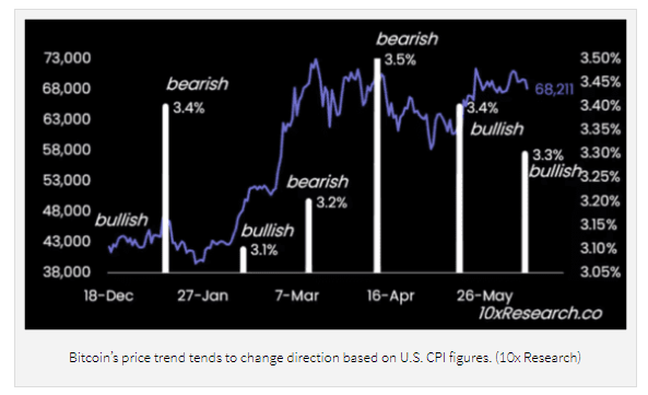 13일(현지 시간) 코인데스크에 따르면 10x 리서치는 이날 고객 노트에서 비트코인은 소비자물가지수(CPI)가 낮아지면 상승하는 경향이 있으며 이런 추세가 재개될 것으로 내다봤다.