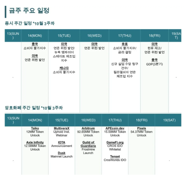 10월 둘째 주 비트코인 가격은 전주 대비 0.07% 소폭 상승한 6만 2867달러에 거래를 마쳤습니다. 지난주 미국 소비자물가지수(CPI)가 예상치를 상회하자 금리 인하가 급하게 이루어지지 않을 것이라는 전망이 부각되며 미 증시와 암호화폐 시장은 약세를 이어갔습니다.