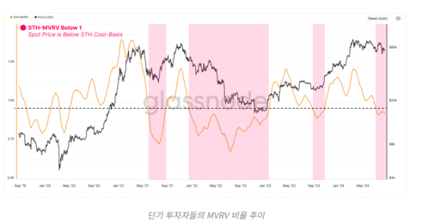글래스노드는 최근 몇 주 동안 단기 보유자들의 시장 가치 대비 실현 가치(MVRV) 비율이 1.0 이하로 떨어졌음을 지적했다.