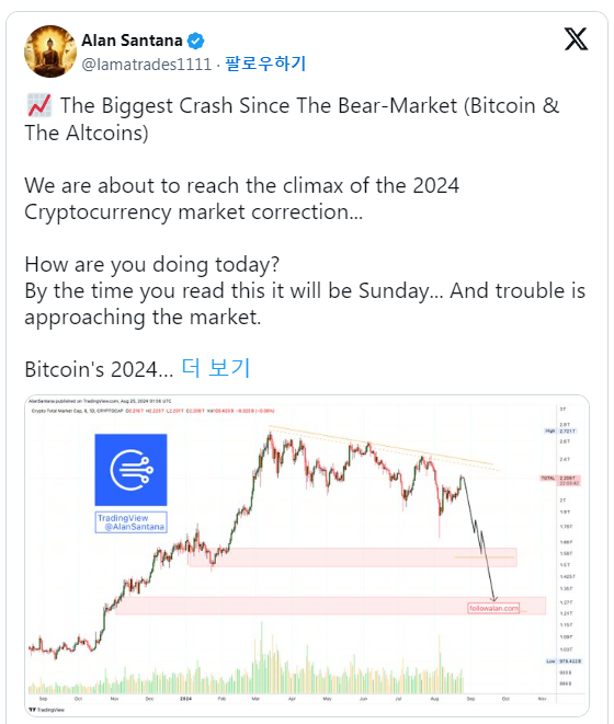 25일(현지 시간) 분석가 알란 산타나(Alan Santana)는 비트코인 차트를 엑스에 공유하며, “비트코인 항복 이벤트가 곧 도래할 것이며 알트코인을 포함한 전체 암호화폐 시장에 약세가 예상된다” 고 주장했다.