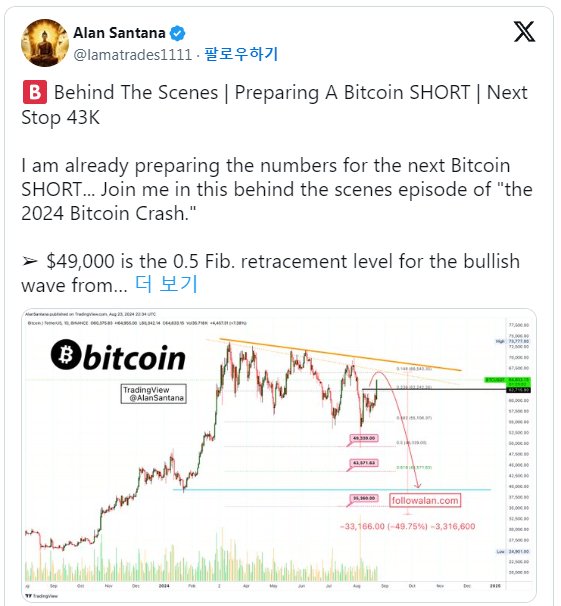 [블록미디어 이제인 기자] 비트코인이 64K에서 견고한 흐름을 보이는 가운데 엑스 팔로워 13만 명의 분석가가 대폭락 시나리오를 제시해 눈길을 끈다.