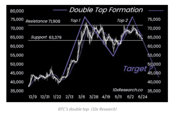 비트코인 더블탑 패턴, $5만까지 잠재적 하락 가능성 시사 – 10x 리서치