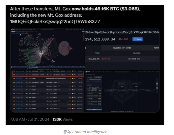 코인데스크는 31일(현지 시간) 아캄 인텔리전스 데이터를 인용, UTC 시간 기준으로 화요일 자정을 조금 앞두고 마운트곡스 관련 주소들이 보유한 4만7229 BTC(약 31억 달러 상당)의 내부 이동이 있었으며 이 중 약 3만4000 BTC(23억 달러 상당)는 이후 새로운 주소로 전송됐다고 보도했다.