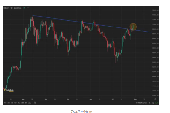 29일(현지 시간) 코인데스크에 따르면 비트코인은 3월 고점과 4월 고점을 연결하는 하방향으로 기울어진 추세선을 돌파했다. 비트코인은 지난 몇 달간 추세선 돌파에 실패하면서 하락 조정을 경험한 사례가 있다.