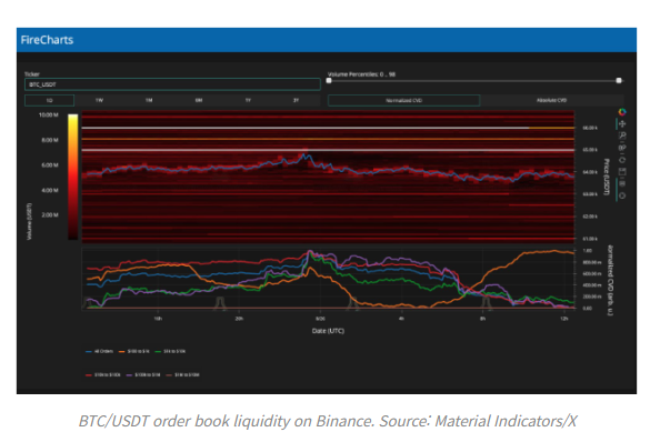 머티리얼 인디케이터스는 “파이어차트(FireCharts)가 비트코인의 매수 유동성이 6만2500 달러로 하락하고 있음을 보여준다”면서 “이런 움직임은 가격을 하방향으로 끌어내리는 경향이 있다. 또 뒤늦게 숏 포지션에 진입하려는 사람들을 유인하는 경향이 있다”고 밝혔다.