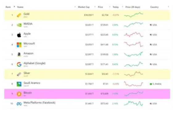 상위 자산 시총 목록에는 금, 엔비디아, 애플 등 주요 기술 기업과 귀금속이 포함되어 있으며, 그 뒤로 마이크로소프트, 아마존, 알파벳(구글) 등이 자리하고 있다. 비트코인은 현재 8위인 사우디 아람코를 바짝 뒤쫓고 있다.