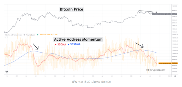 첫 번째 지표는 ‘활성 주소 모멘텀’으로, 비트코인 활성 주소의 30일 및 365일 이동 평균선을 활용한다. 활성 주소는 송수신 거래를 진행하는 주소를 의미하며, 이 지표는 현재 블록체인 활동 수준을 나타낸다.