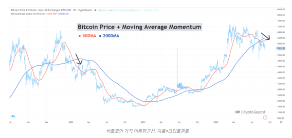 크립토퀀트의 분석에 따르면 비트코인 관련 3개의 주요 모멘텀 지표가 최근 ‘데드 크로스’ 패턴을 보였다. 이 지표들은 중요한 이동 평균선(MA)들의 조합으로 구성된다.