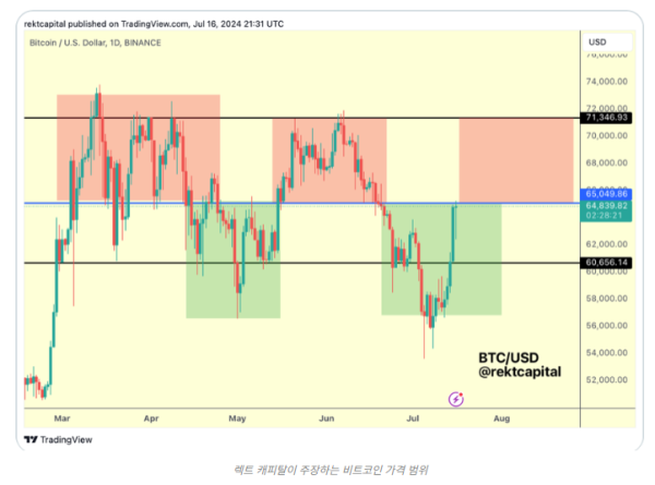 익명의 암호화폐 트레이더 렉트 캐피탈(Rekt Capital)은 엑스 게시물에서 “6만5000 달러를 돌파하면 6만5000~7만1500 달러 범위 내에서 움직일 준비가 된다”고 말했다.
