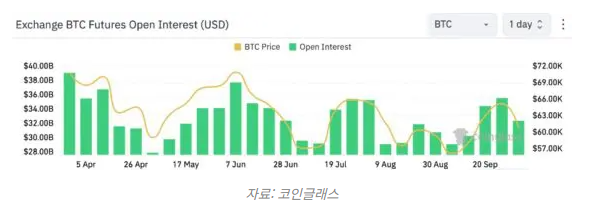 코인글래스(CoinGlass) 데이터에 따르면, 9월 27일 비트코인 미결제 약정은 355억2000만 달러에 도달해 6월 7일 이후 최고치를 기록했다. 당시 비트코인은 7만 759달러에 근접한 사상 최고가를 기록한 후 30일 만에 약 18% 하락해 5만 8239달러까지 떨어졌다.