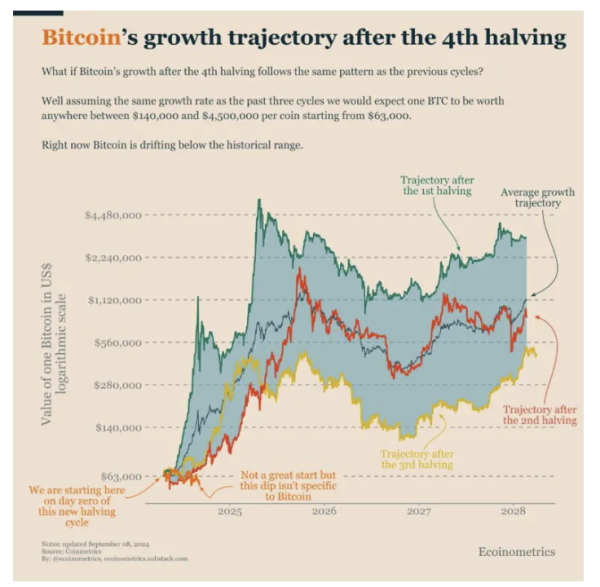 경제 분석 플랫폼인 이코노메트릭스는 X(구 트위터) 게시물을 통해 네 번째 반감기 이후 비트코인의 가격 움직임을 이전 반감기 사이클과 비교했다. 역사적으로 비트코인은 반감기 이후 가격 상승을 경험하며 상당한 이익을 기록해왔다.