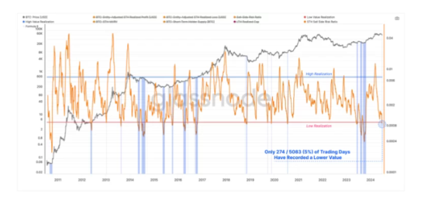 글래스노드는 또한 지난 60일 동안 가장 높은 가격과 가장 낮은 가격 틱 사이의 백분율 범위를 평가하고 비트코인의 시장 변동성이 드물게 볼 수 있는 수준으로 압축되고 있는 것을 발견했다.