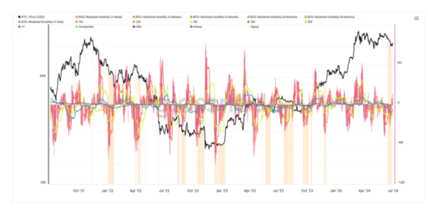 글래스노드의 분석가들은 여러 시간 프레임에서 비트코인 가격의 변동성이 감소하고 있음을 주목했다.