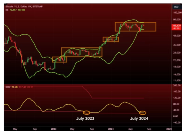 또 다른 트레이더인 맥스비커즈 BTC(MaxBecauseBTC)도 “비트코인의 주간 볼린저 밴드가 이처럼 타이트했던 시기는 지금까지 2016년 4월과 2023년 8월, 단 두번 뿐이었다”고 강조했다.