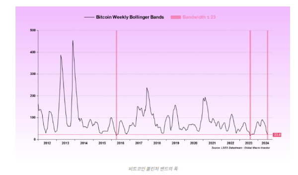 “볼린저 밴드가 역사적으로 정말 미친 듯이 압축 돼 있다. 주간 볼린저 밴드가 이렇게 압축된 것은 역사상 두 번뿐이었다. 2016년 4월과 2023년 7월.”
