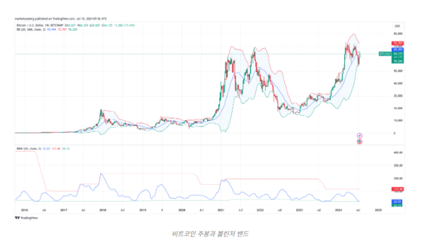 가격의 범위: 상단 밴드와 하단 밴드는 가격의 변동 범위를 나타낸다. 가격이 상단 밴드에 가까워지면 과매수 상태를, 하단 밴드에 가까워지면 과매도 상태를 나타낼 수 있다.