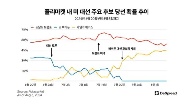 실제 암호화폐 예측 시장 플랫폼 폴리마켓에서도 눈에 띄는 변화가 있었다. 지난달 21일 조 바이든 미국 대통령이 이번 대선 후보를 사퇴하며 해리스를 민주당 대통령 후보로 지지하겠다는 견해를 밝혔다. 폴리마켓에 따르면 이때 해리스의 예측 당선 확률은 약 20% 가까이 상승했으며 현재는 대선 토론 이전 바이든의 예측 당선 확률이었던 34.5%를 넘어선 44%에 위치하며 빠르게 트럼프를 추격하고 있다.