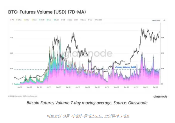 비트코인 선물 계약 거래량은 일일 약 500억 달러로, 비트코인이 사상 최고치인 7만3679달러를 기록했던 3월 이후 거래량의 약 50%에 불과하다. 8월 초 비트코인 가격이 8일간 22% 하락해 5만3991달러를 기록했을 때 거래량은 다시 800억 달러에 근접했다.