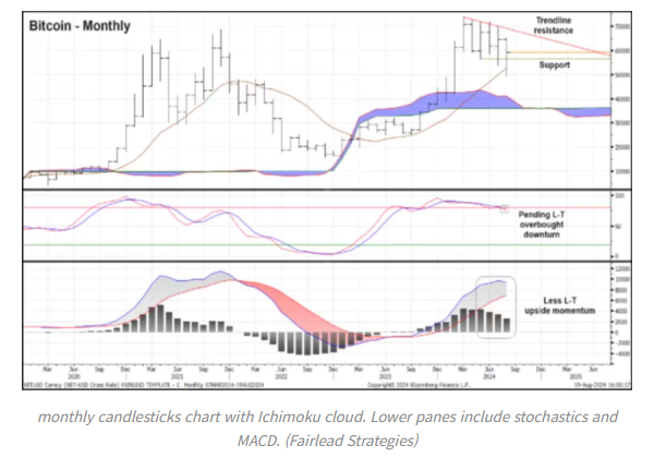 스토캐스틱 지표의 잠재적 과매수 하락 전환과 함께 MACD(이동평균수렴·발산) 막대의 높이가 낮아졌고 이치모쿠 구름이 평탄해진 것은 앞으로의 시장 환경이 “도전적”일 수 있음을 경고하는 것이라고 페어리드 스트래티지스는 설명했다.
