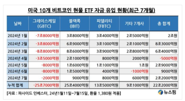 이 물량은 환매제한 등으로 묶여 있다가 ETF 상장과 동시에 대거 매물로 출회됐다. 결국 그레이스케일 GBTC ETF에서만 누적 25조7000억원(186억달러)이라는 어마어마한 자금 유출이 발생했다. 다행스러운 건 5월부터 그레이스케일의 자금유출이 눈에 띄게 감소했다는 점이다.