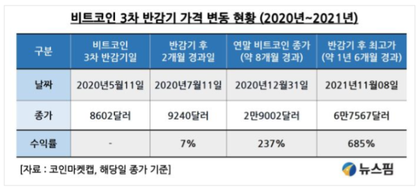 3차 반감기 역시 더 큰 상승은 반감기 다음해인 2021년에 나왔다. 3차 반감기 날짜로부터 약 1년 6개월 경과한 2021년 11월 8일에 6만7567달러를 기록하며 최고점을 찍었다. 수익률은 무려 685%를 기록했다.