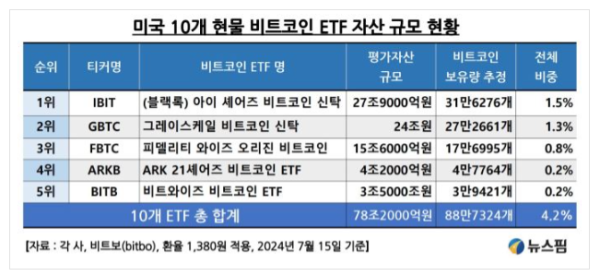 현재 10개의 비트코인 ETF가 매수한 비트코인 수량은 약 89만개로 전체 물량의 4.2%에 달한다. 비트코인 ETF를 통해 주요 기관투자자들이 본격적으로 자신들의 포트폴리오에 비트코인을 편입하고 있다.