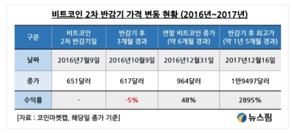 하지만 이후부터 큰 폭의 상승이 시작됐다. 결국 연말인 2020년 12월말에는 비트코인 가격이 2만9002달러로 치솟았다. 반감기 후 불과 8개월만에 237%라는 경이적인 수익률을 기록한 셈이다.