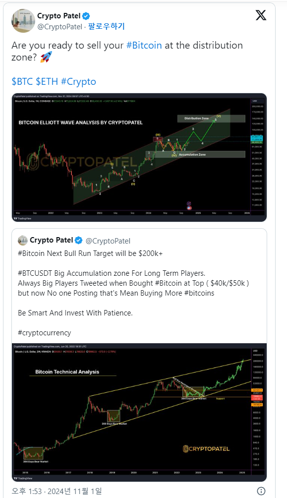 크립토패텔의 분석은 비트코인이 엘리엇 파동의 마지막 5번째 파동에 진입하고 있음을 시사한다. 비트코인은 이미 1~3 파동을 거쳤으며, 현재는 축적 구간 내에서 제4 파동을 진행 중이다. 이후 제5 파동에 진입할 경우 강력한 랠리를 보일 가능성이 있으며, 이는 사상 최고가를 경신할 가능성을 높인다.