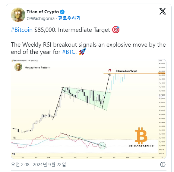 “비트코인 8만5000달러: 중간 목표치”라는 요약과 함께, “주간 RSI의 돌파는 연말까지 BTC의 폭발적인 움직임을 의미한다”고 설명했다.